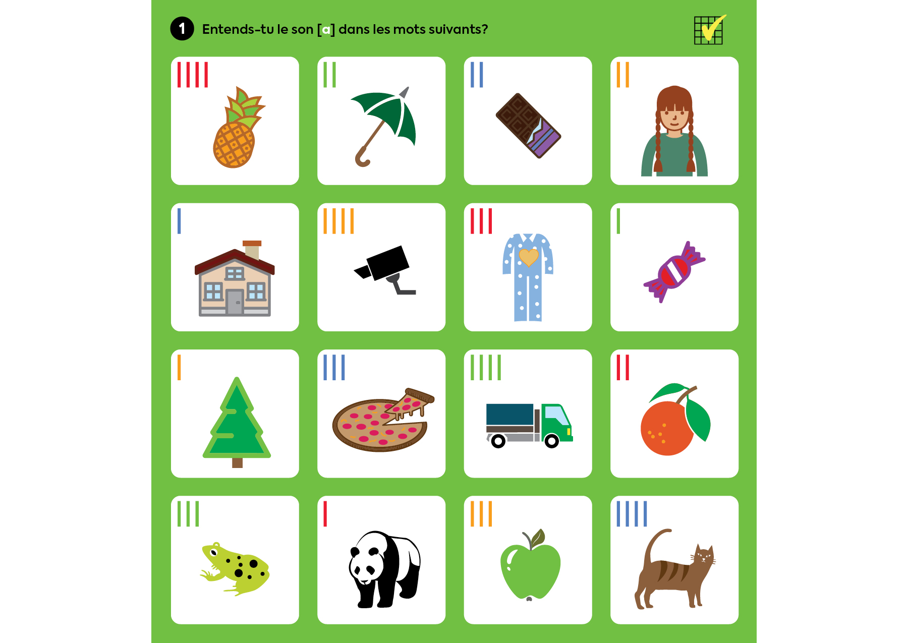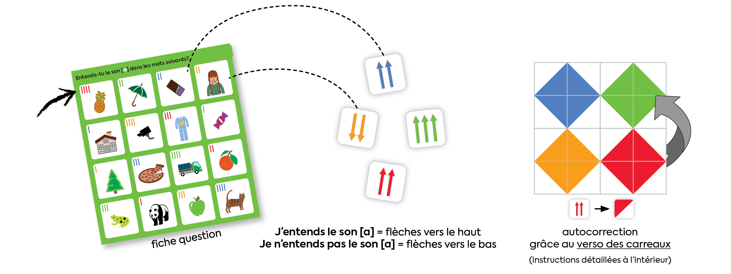 Vous remarquerez que seules des images sont présentées et que les mots ne sont pas écrits. C’est voulu, car certains enfants chercheraient à repérer les lettres au lieu de porter attention aux sons.