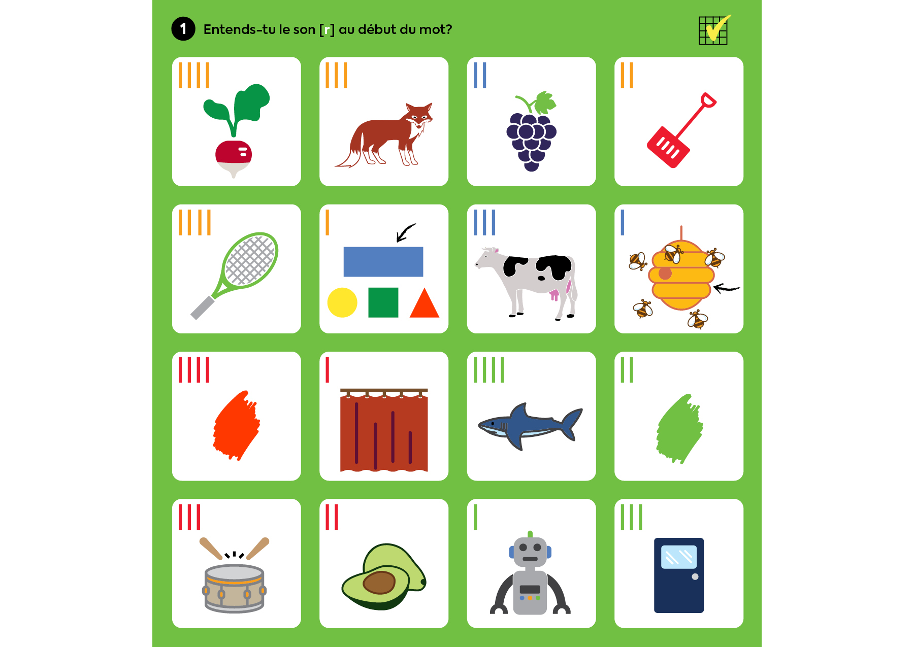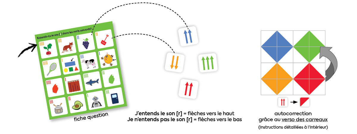 Dans les exercices, on présente seulement les images, les mots ne sont pas écrits. C’est voulu, car certains enfants chercheraient à repérer les lettres au lieu de bien porter attention aux sons. D’ailleurs, pour ces activités, il faut tenir compte du son recherché sans tenir compte de l’orthographe des mots.