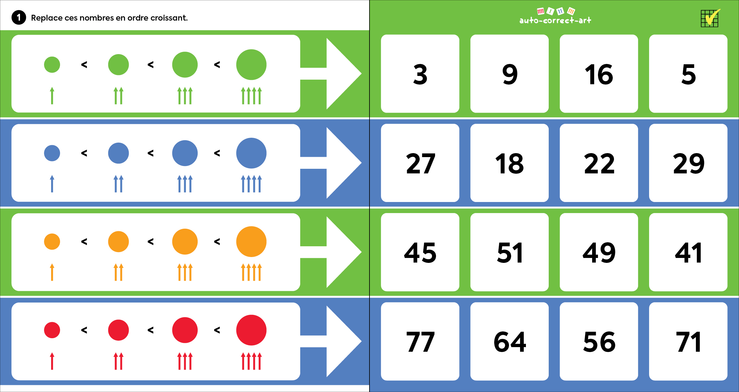 1 et 2, l’enfant devra placer les nombres en ordre croissant. Dans les activités 3 et 4, il devra de les placer en ordre décroissant. Finalement, dans les activités 5 et 6, il lui faudra trouver le nombre suivant en comptant par bonds.